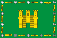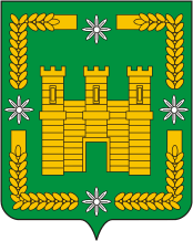"В зелёном поле – золотая, с тремя зубчатыми башнями и со сквозною, без порога, аркой ворот, бревенчатая крепость, сопровождаемая в кайму попеременно четырьмя видимыми сверху цветами астры в крест и столькими же золотыми колосьями без стеблей в углах".