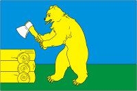 "Флаг представляет собой прямоугольное голубое полотнище с отношением ширины к длине 2:3, воспроизводящее фигуры герба: вдоль нижнего края зеленую полосу в 3/10, над ней посередине полотнища - медведя с топором, а вплотную к древку - сруб в три бревна, воспроизведенные желтым, черным и белым цветом".