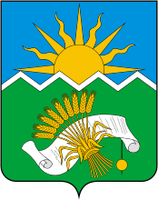 "Лазоревое и зелёное поле повышенно пересечено тонким зубчатым серебряным поясом, в лазори – выходящее сияющее золотое солнце (без изображения лица), в зелени – вписанные пук золотых хлебных колосьев, положенный косвенно справа, и за ним серебряный свиток с золотой печатью на шнуре того же металла, выходящий справа внизу и положенный косвенно слева".