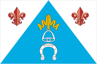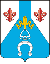 "В серебряном поле лазоревая фигура, составленная из острия и столба, обремененная подвешенным на золотом ремешке серебряным стременем и под ним серебряной подковой двумя шипами вниз; по сторонам фигура сопровождена червлеными лилиями".