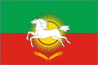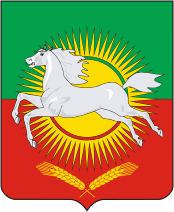 "В пересечённом зеленью и червленью (красным) поле - золотое сияющее солнце (без изображения лица), диск которого окаймлён вверху зеленью, а внизу червленью, и поверх всего - скачущий серебряный конь, в оконечности две золотые головки колосьев, сложенными стеблями накрест".