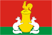 "Флаг представляет собой прямоугольное красное полотнище с отношением ширины к длине 2:3, несущее вдоль нижнего края зеленую полосу в 2/9 ширины полотнища и воспроизводящее посередине полотнища фигуры герба района: двух норок, изображенных белым и серым цветами, держащих жёлтый кувшин с зерном и стоящим на нем петухом того же цвета".