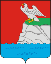 "В червлёном (красном) поле над лазоревой (синей, голубой) волнистой оконечностью – выходящий слева берег с серебряным обрывом и зелёным верхом, на котором сидит обращённый вправо серебряный, с золотыми клювом и лапами и с распростёртыми крыльями, сокол".