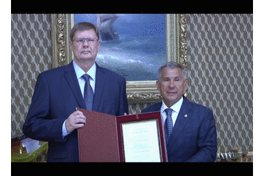 Event: Tatarstan President Rustam Minnikhanov is handing in the Tupolev International Prize for outstanding contribution in the field of engineering sciences to Director General of United Engine Corporation Aleksandr Artyukhov. 12.11.2019