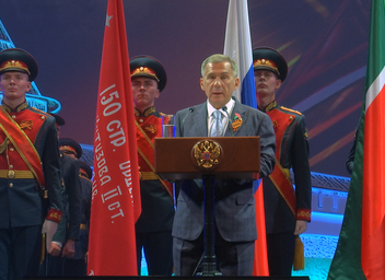 Event: Theatrical prologue and a solemn passage of the troops of the Kazan garrison and special forces. Tatarstan President Rustam Minnikhanov is taking part. 09.05.2018