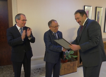 Event: Tatarstan Prime Minister Alexey Pesoshin is handing in the International award named after A.N.Tupolev to Doctor of Technical Sciences, Corresponding Member of the Russian Academy of Sciences Alexander Inozemtszev. 08.11.2017