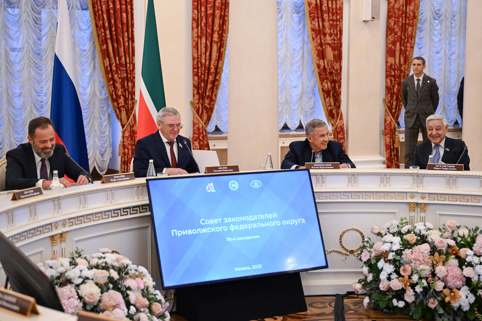 78-е заседание Совета законодателей Приволжского федерального округа. Принимают участие полномочный представитель Президента Российской Федерации в Приволжском федеральном округе Игорь Анатольевич Комаров, Раис Республики Татарстан Р.Н.Минниханов. 05.12.2025