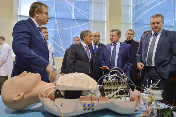 Посещение Полномочным представителем Президента РФ в Крымском федеральном округе О.Е.Белавенцевым, Главой Республики Крым С.В.Аксеновым и Президентом РТ Р.Н.Миннихановым нового Учебно-лабораторного кампуса Института фундаментальной медицины и биологии и Регионального инжинирингового центра медицинских симуляторов "Центр Мединицинской Науки". Фото Марсель Бадыкшин