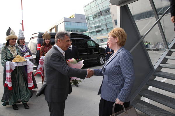 Прибытие в Республику Татарстан Министра здравоохранения Российской Федерации Вероники Игоревны Скворцовой. Встречает Президент Республики Татарстан Р.Н.Минниханов.: фото Михаила Козловского