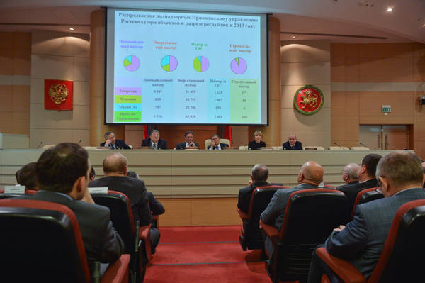 Заседание коллегии Управления Федеральной службы по экологическому, технологическому и атомному надзору "Об итогах работы предприятий и организаций поднадзорных Приволжскому управлению Ростехнадзора по обеспечению промышленной и энергетической безопасности в 2013 году и задачах на 2014 год". Принимают участие руководитель Федеральной службы по экологическому, технологическому и атомному надзору А.В.Алешин и Президент РТ Р.Н.Минниханов. Фото Марсель Бадыкшин