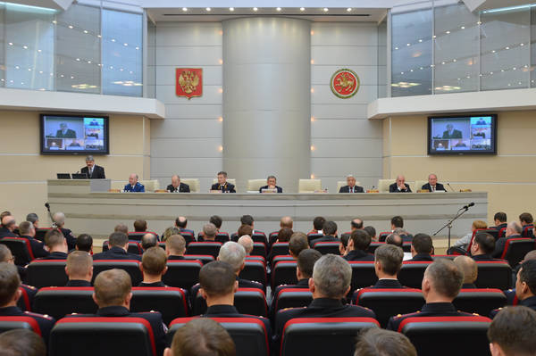 Расширенное заседание коллегии Министерства внутренних дел по Республике Татарстан в режиме видеоконференции «Об итогах оперативно-служебной деятельности органов и подразделений внутренних дел за 2013 год и задачах на последующий период». Принимает участие Президент Республики Татарстан Р.Н.Минниханов. Фото Марсель Бадыкшин