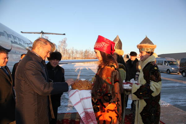 Прибытие в Республику Татарстан Президента, Председателя Правления ОАО «Сбербанк России» Германа Оскаровича Грефа. Встречает Президент Республики Татарстан Р.Н.Минниханов.: фото Михаила Козловского