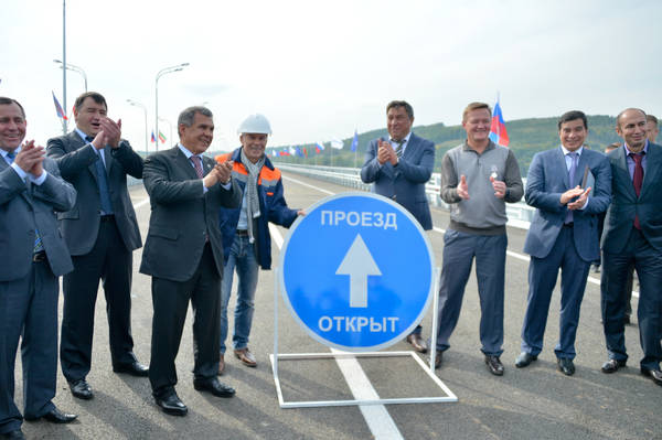 Открытие рабочего движения по мостовому переходу автомобильной дороги М-7 «Волга» через р. Вятка после завершения второй очереди реконструкции. Принимает участие Президент Республики Татарстан Р.Н.Минниханов. Фото Марсель Бадыкшин