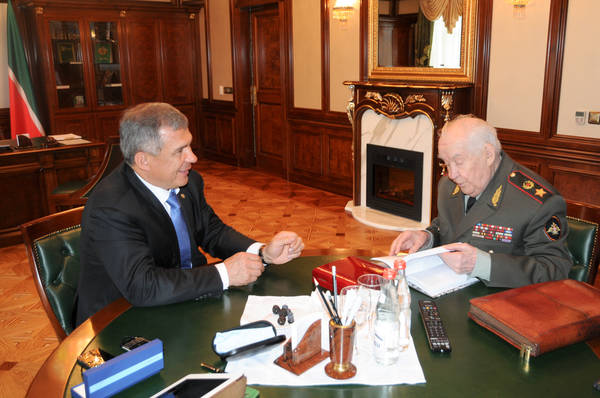 Встреча Президента Республики Татарстан Рустама Минниханова с президентом Академии военных наук Российской Федерации, генералом армии, доктором исторических и военных наук Махмутом Гареевым.