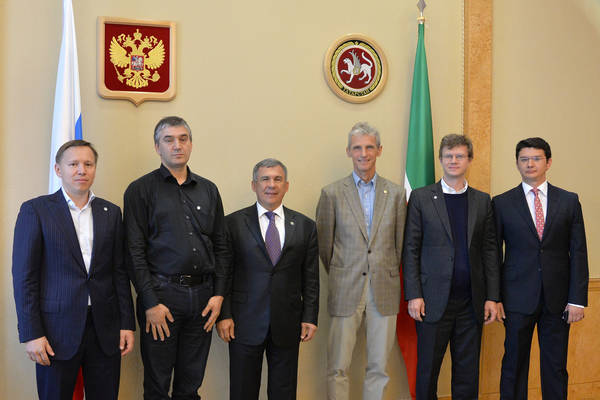 Встреча Президента Республики Татарстан Р.Н. Минниханова с председателем совета директоров и управляющим директором компании «IPG Photonics», генеральным директором ООО НТО «ИРЭ-Полюс» Валентином Павловичем Гапонцевым. Фото Марсель Бадыкшин