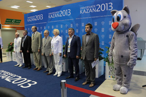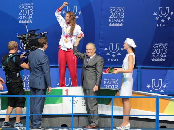 XXVII Всемирная летняя Универсиада. Церемония награждения победителей соревнований по плаванию. Принимает участие Государственный Советник Республики Татарстан М.Ш. Шаймиев : фото Михаила Козловского