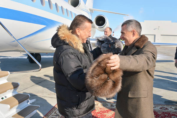 Прибытие в Республику Татарстан Председателя Совета директоров ОАО "Газпром", Председателя Правления и генерального директора ООО "Газпром газомоторное топливо" Виктора Алексеевича Зубкова. Встречает Президент Республики Татарстан Р.Н. Минниханов.фото Рустема Кадырова.