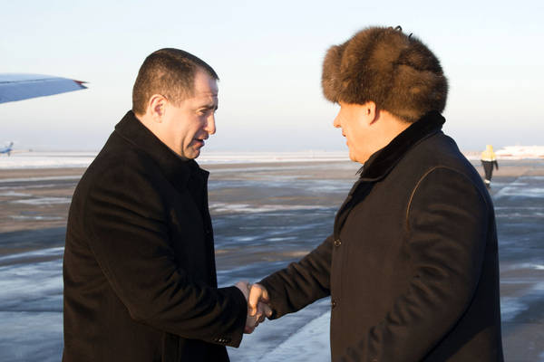 Прибытие в Республику Татарстан полномочного представителя Президента Российской Федерации в Приволжском федеральном округе Михаила Викторовича Бабича. Встречает Президент Республики Татарстан Р.Н.Минниханов. Фото Ринат Сафин