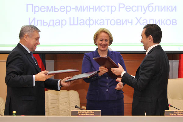 Подписание Республиканского соглашения между Федерацией профсоюзов Республики Татарстан, Координационным советом объединений работодателей Республики Татарстан, Кабинетом Министров Республики Татарстан о проведении социально-экономической политики и развитии социального партнерства на 2013 – 2014 годы. Принимает участие Премьер-министр Республики Татарстан И.Ш.Халиков. Фото Ринат Сафин