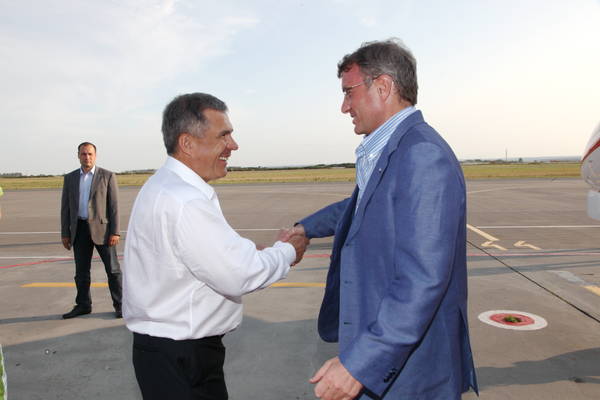 Прибытие в Республику Татарстан президента, председателя Правления ОАО «Сбербанк России» Германа Оскаровича Грефа. Встречает Президент Республики Татарстан Р.Н.Минниханов.: фото М, Козловского