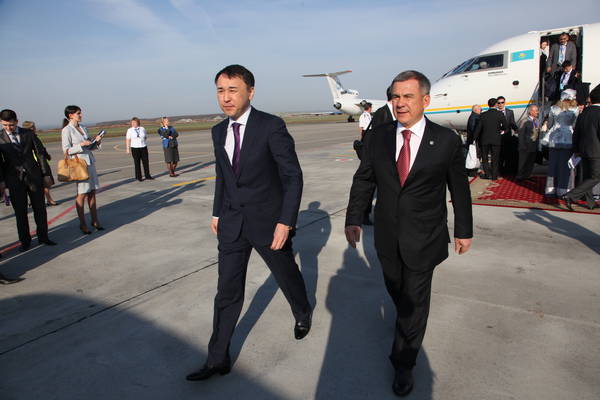 Прибытие делегации Актюбинской области Республики Казахстан во главе с Акимом Актюбинской области А.Б.Мухамбетовым. Встречает Президент Республики Татарстан Р.Н.Минниханов: фото М. Козловского
