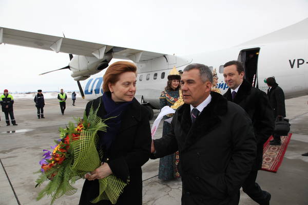 Прибытие в Республику Татарстан Губернатора Ханты-Мансийского автономного округа. Комаровой Натальи Владимировны. Встречает Президент Республики Татарстан Р.Н.Минниханов.: фото М. Козловского