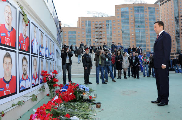 Возложение цветов Премьер-министром РТ И.Ш.Халиковым в память о погибших хоккеистах. фото Р.Кадырова.