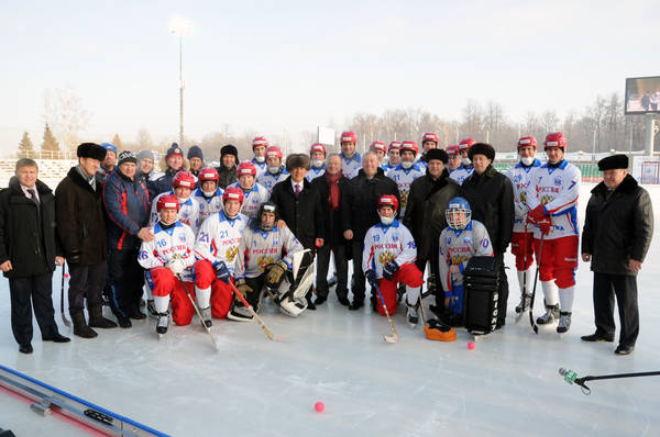 Встреча Президента Республики Татарстан Р.Н.Минниханова со сборной России по хоккею с мячом. фото Р.Кадырова.