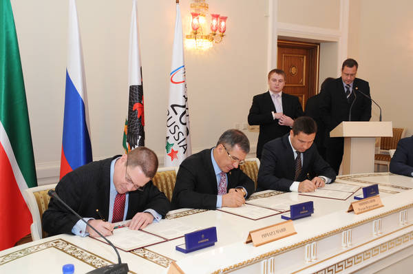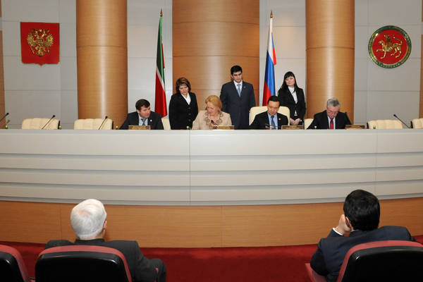 Торжественное подписание Республиканского трехстороннего Соглашения между Федерацией профсоюзов Республики Татарстан, Координационным советом объединений работодателей Республики Татарстан и Кабинетом Министров Республики Татарстан. Фото Ринат Сафин