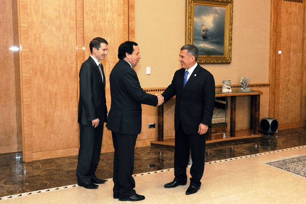 Встреча Президента Республики Татарстан Р.Н. Минниханова с Чрезвычайным и Полномочным Послом Тунисской Республики в Российской Федерации господином Кхемаиесом ЖИНАУИ.фото Р.Кадырова.