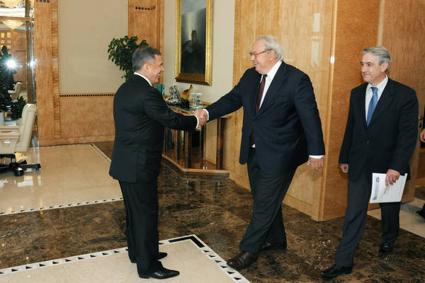 Встреча Президента Республики Татарстан Р.Н.Минниханова с председателем Наблюдательного Совета "Кнорр-Бремзе АГ" Хайнцом Тиле Принимает участие Премьер-министр Республики Татарстан И.Ш.Халиков. фото Р.Кадырова.