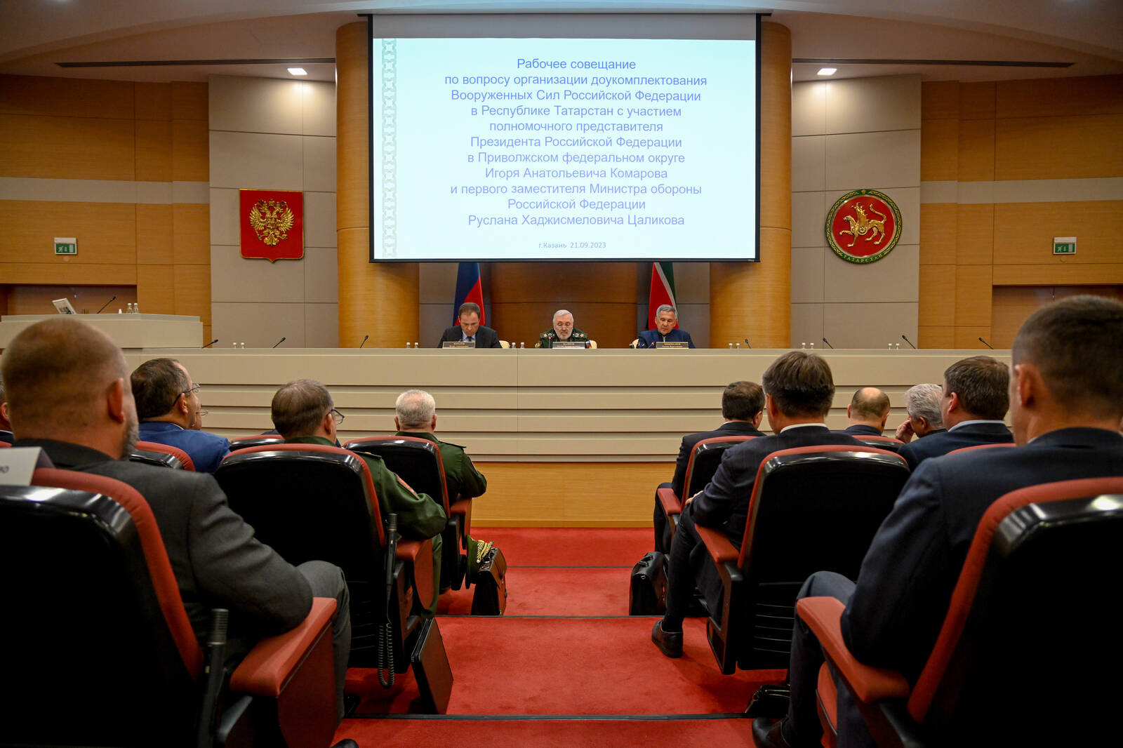 Рабочее совещание Раиса Республики Татарстан Р.Н. Минниханова, полномочного представителя Президента Российской Федерации в Приволжском федеральном округе И.А. Комарова и первого заместителя Министра обороны Российской Федерации Р.Х. Цаликова