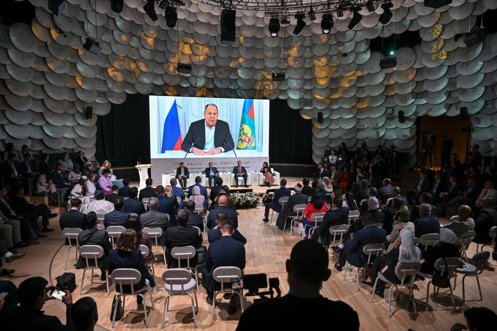 Пленарное заседание Казанского глобального молодежного саммита. Принимают участие Министр науки и высшего образования Российской Федерации Валерий Николаевич Фальков, Раис Республики Татарстан Р.Н.Минниханов, президент Молодежного форума Организации Исламского сотрудничества Таха Айхан.