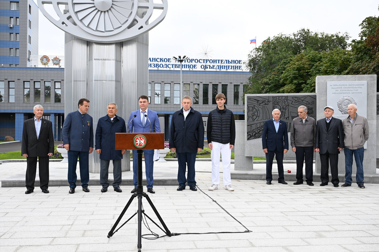 Торжественная церемония открытия барельефа генерального директора АО "Казанское моторостроительное производственное объединение" (с 1983 по 2004 годы) Александра Филипповича Павлова и памятной стелы, посвященной истории завода. Принимает участие Раис Республики Татарстан Р.Н.Минниханов.
