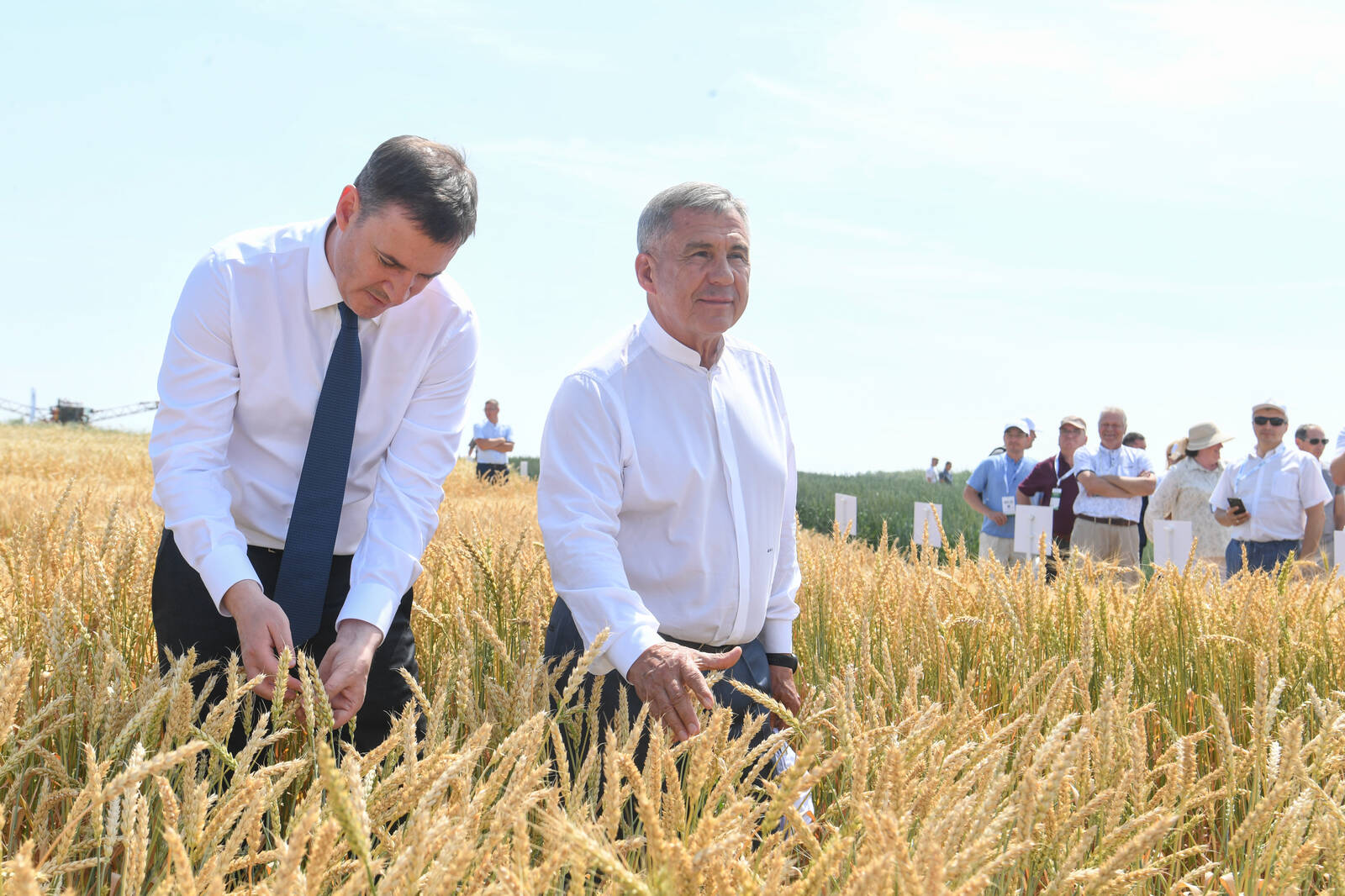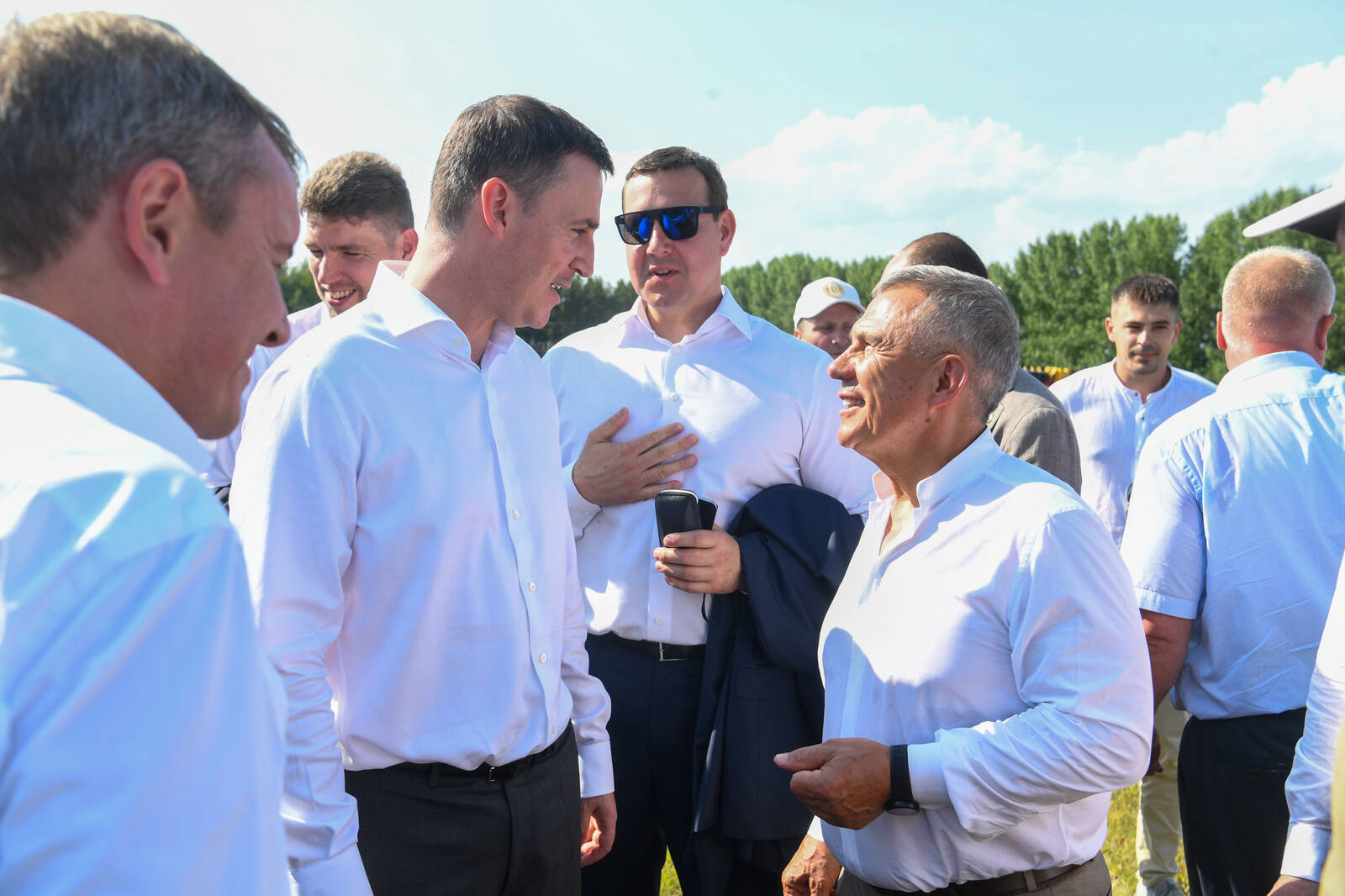 Открытие выставки «Всероссийский день поля – 2023» и осмотр экспозиции. Принимают участие Раис Татарстана Рустам Минниханов, министр сельского хозяйства РФ Дмитрий Патрушев и Государственный Советник РТ Минтимер Шаймиев.