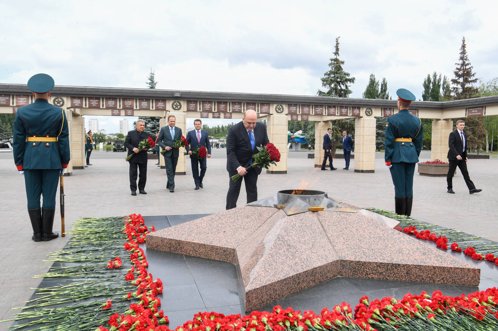 Возложение цветов в Парке Победы. Принимают участие Председатель Правительства Российской Федерации М.В. Мишустин и Раис Республики Татарстан Р.Н. Минниханов