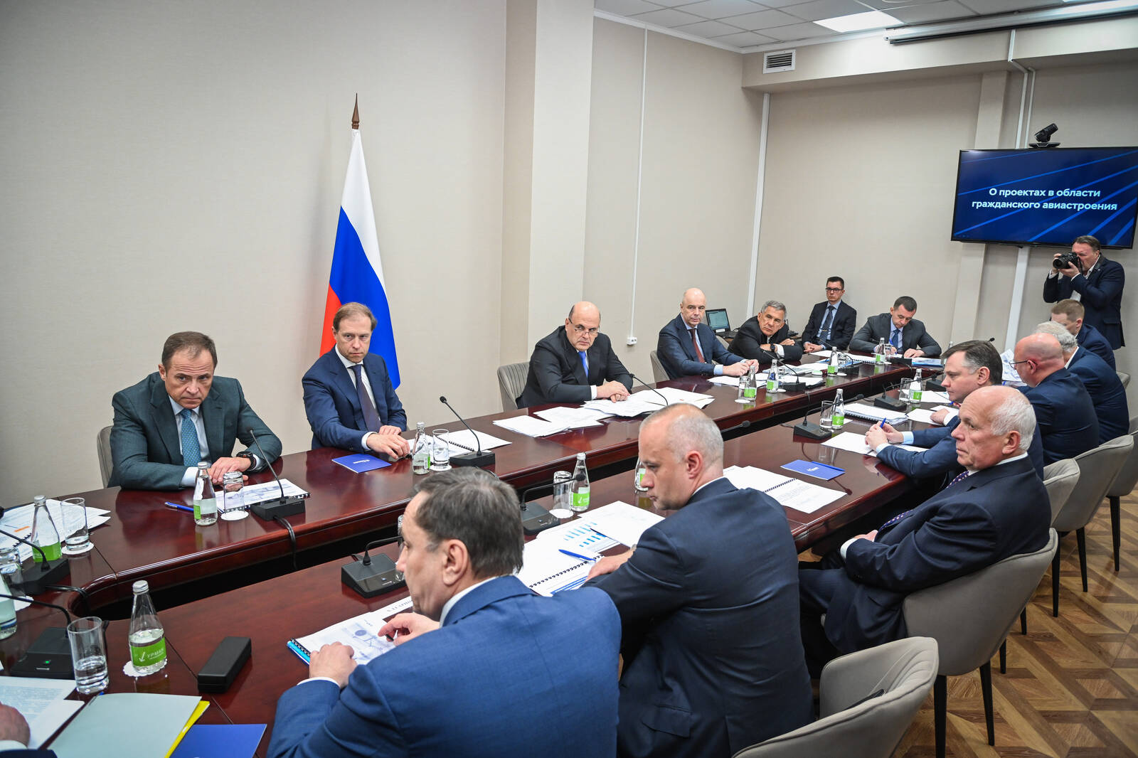 Совещание по развитию гражданской авиации в России. Принимают участие Председатель Правительства Российской Федерации М.В.Мишустин и Раис Республики Татарстан Р.Н.Минниханов