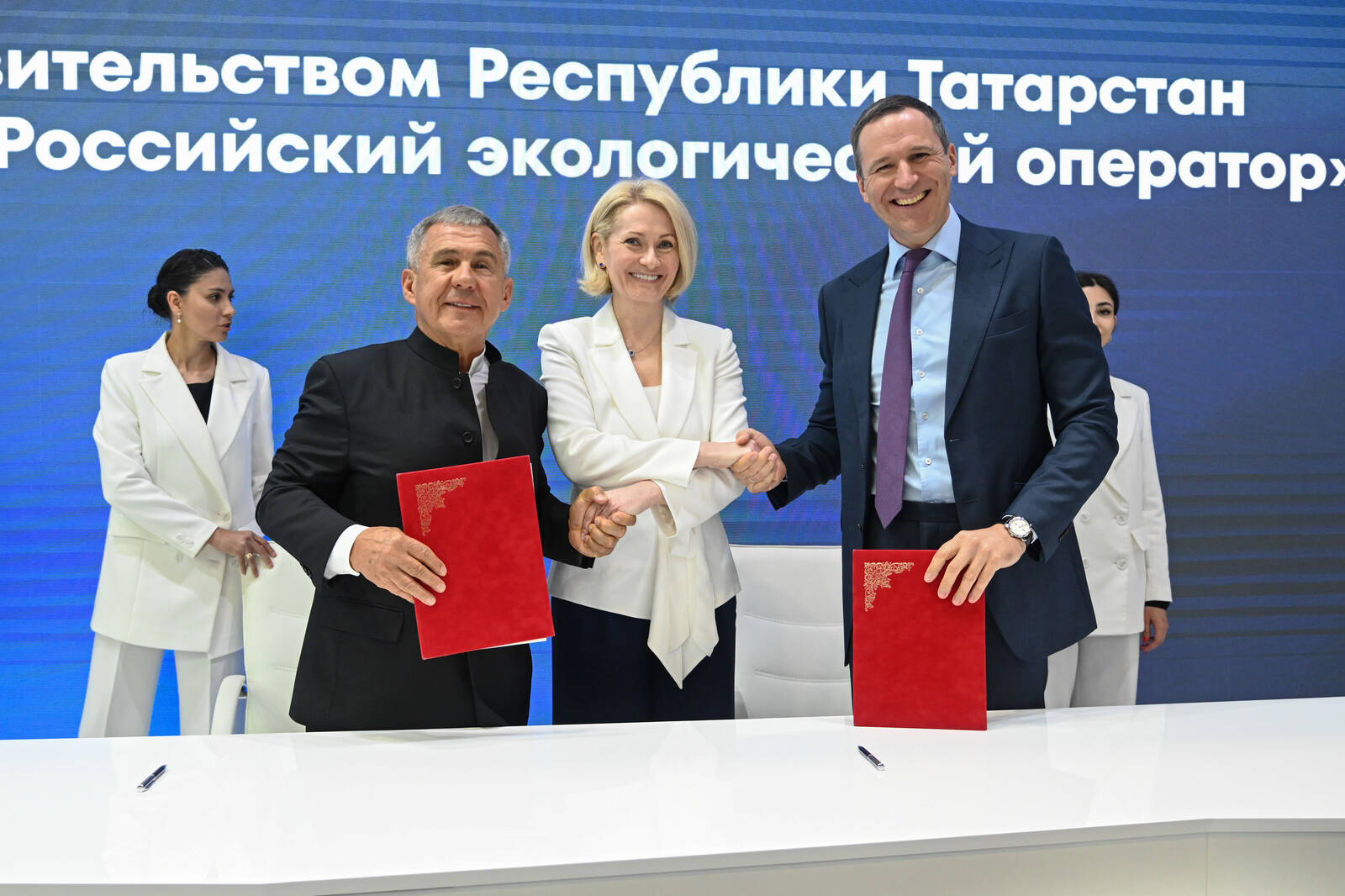 Подписание Соглашения о сотрудничестве между Правительством Республики Татарстан и ППК «Российский экологический оператор». Участвует Заместитель Председателя Правительства Российской Федерации В.В. Абрамченко.