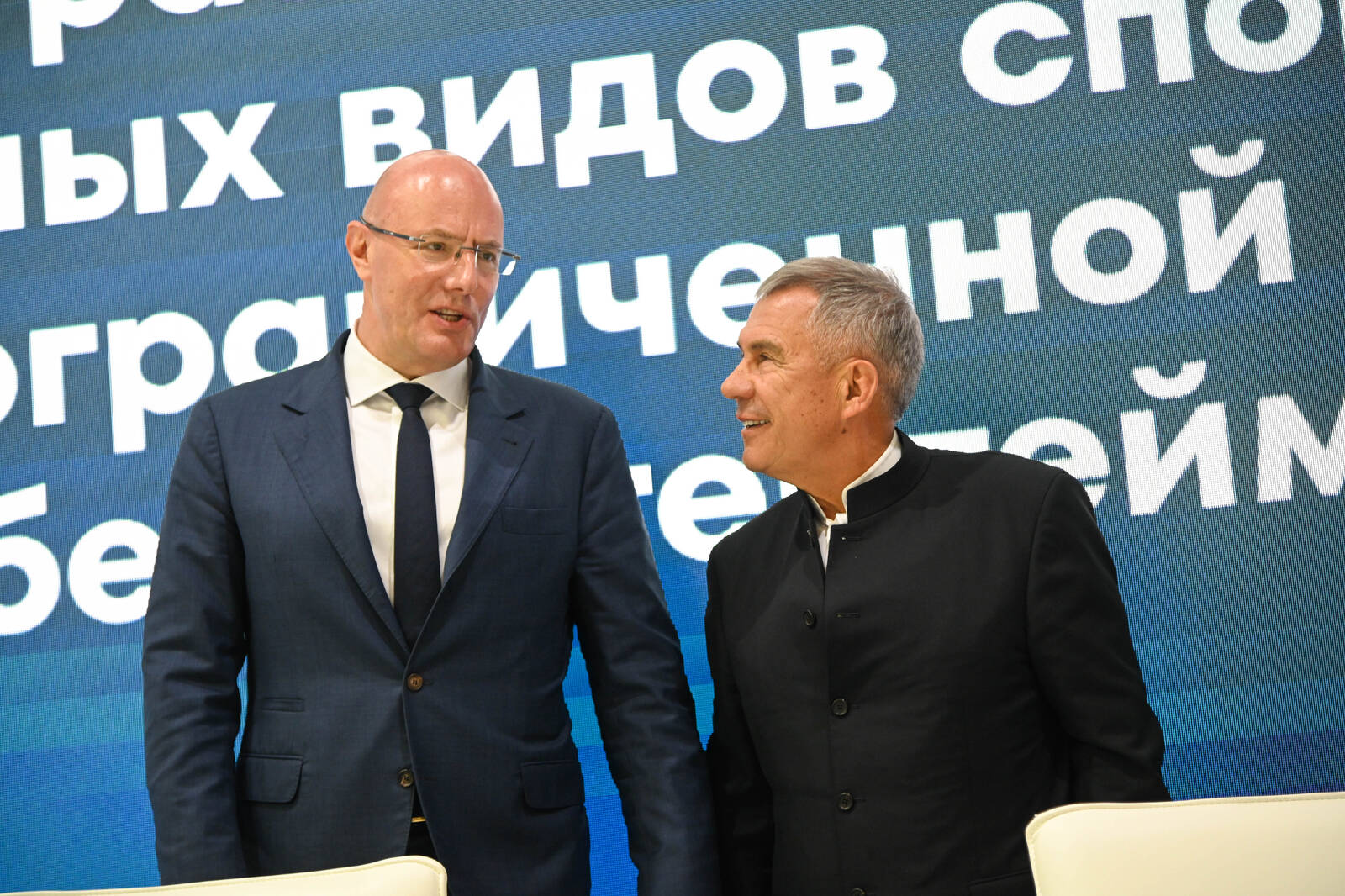 Подписание соглашений между автономной некоммерческой организацией "Агентство развития компьютерного и иных видов спорта" и АО "ПозитивТехнолоджиз", АНО "Цифровая экономика", "СберИнтертеймент", ПАО "Соллерс". Участвуют заместитель Председателя Правительства РФ Дмитрий Чернышенко и Раис Республики Татарстан Рустам Минниханов.