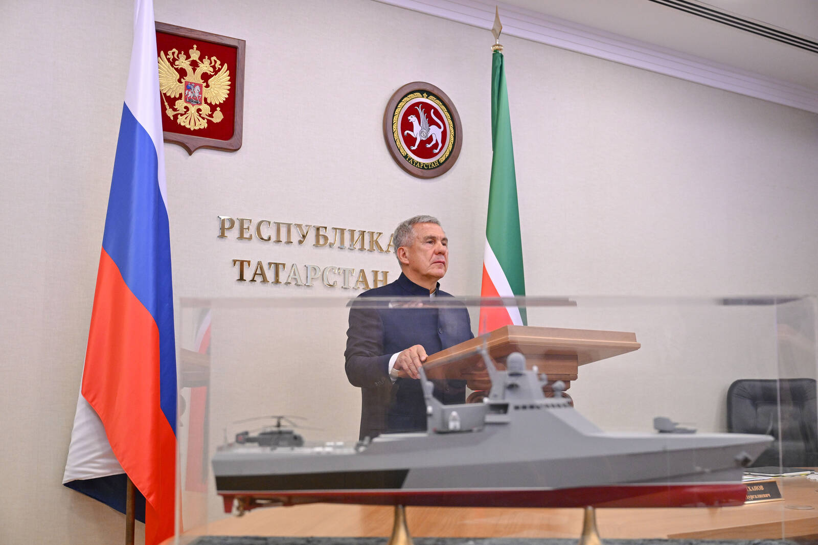 Торжественная церемония подъема флагов на трех кораблях под руководством Главнокомандующего Военно-Морским Флотом Александра Алексеевича Моисеева. Принимает участие Раис Республики Татарстан Р.Н.Минниханов в режиме видеоконференции.