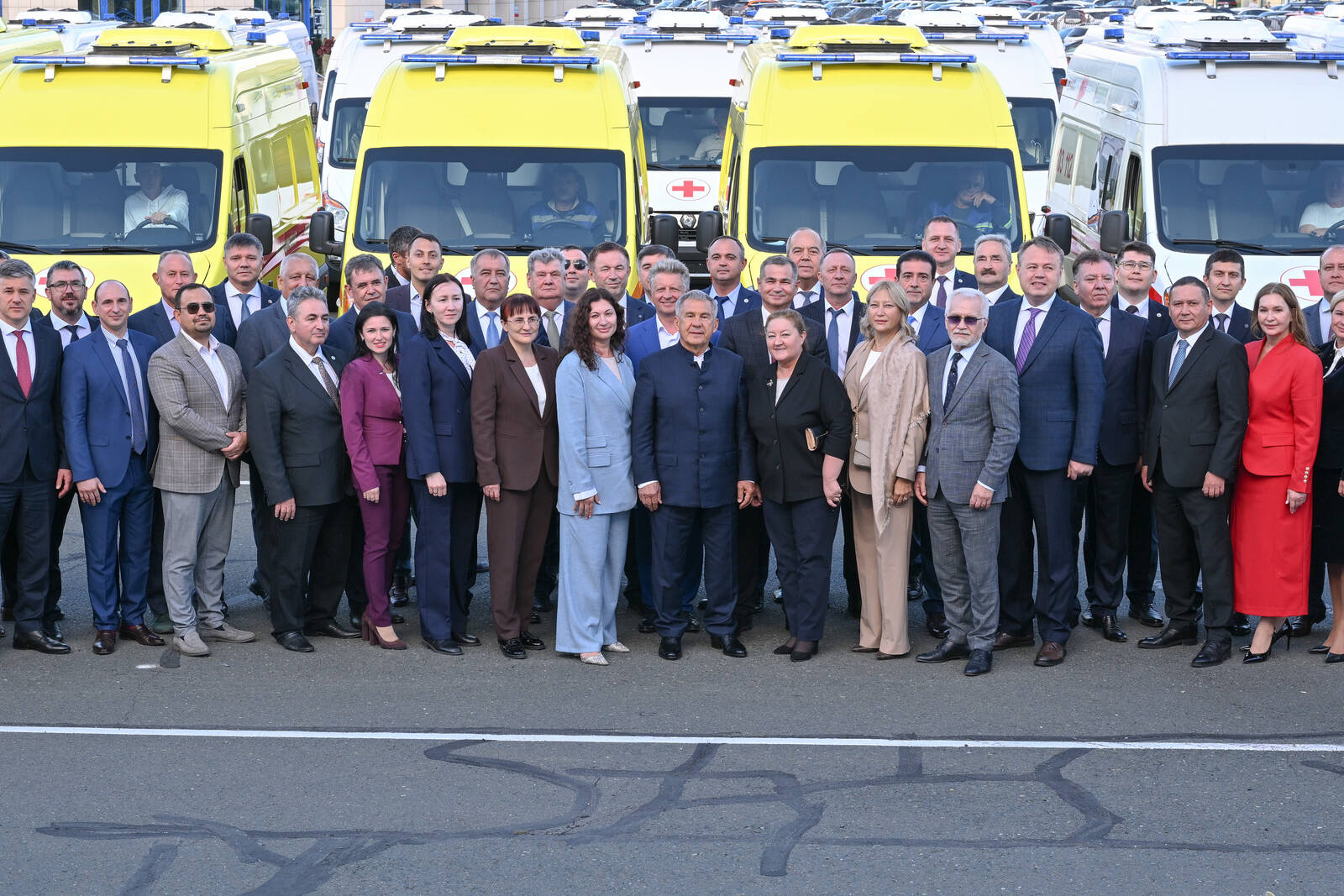 Торжественная церемония передачи автомобильного транспорта и компьютерной техники медицинским организациям Республики Татарстан. Принимает участие Раис Республики Татарстан Р.Н.Минниханов.