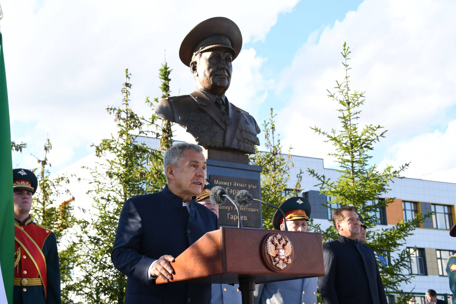 Торжественная церемония открытия бюста участника Великой Отечественной войны 1941–1945 гг., советского и российского военачальника, генерала армии Гареева Махмута Ахметовича. Принимает участие Раис Республики Татарстан Р.Н.Минниханов.