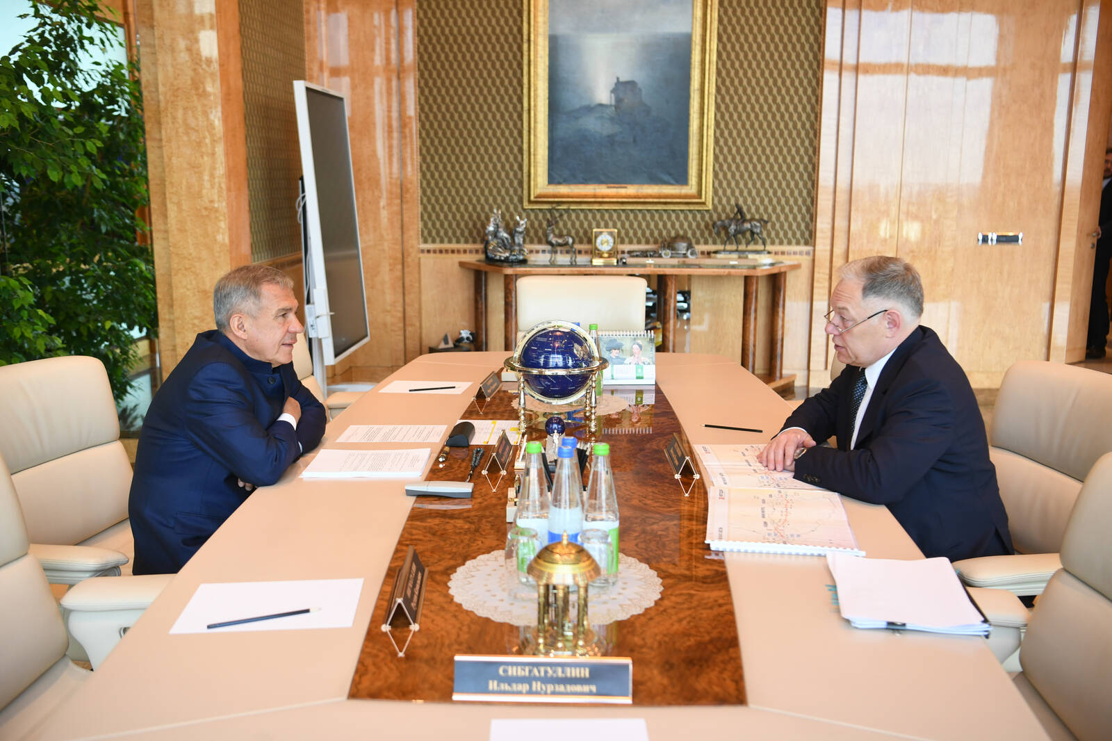 Встреча Раиса Татарстана Рустама Минниханова с председателем правления государственной компании «Российские автомобильные дороги» Вячеславом Петушенко.