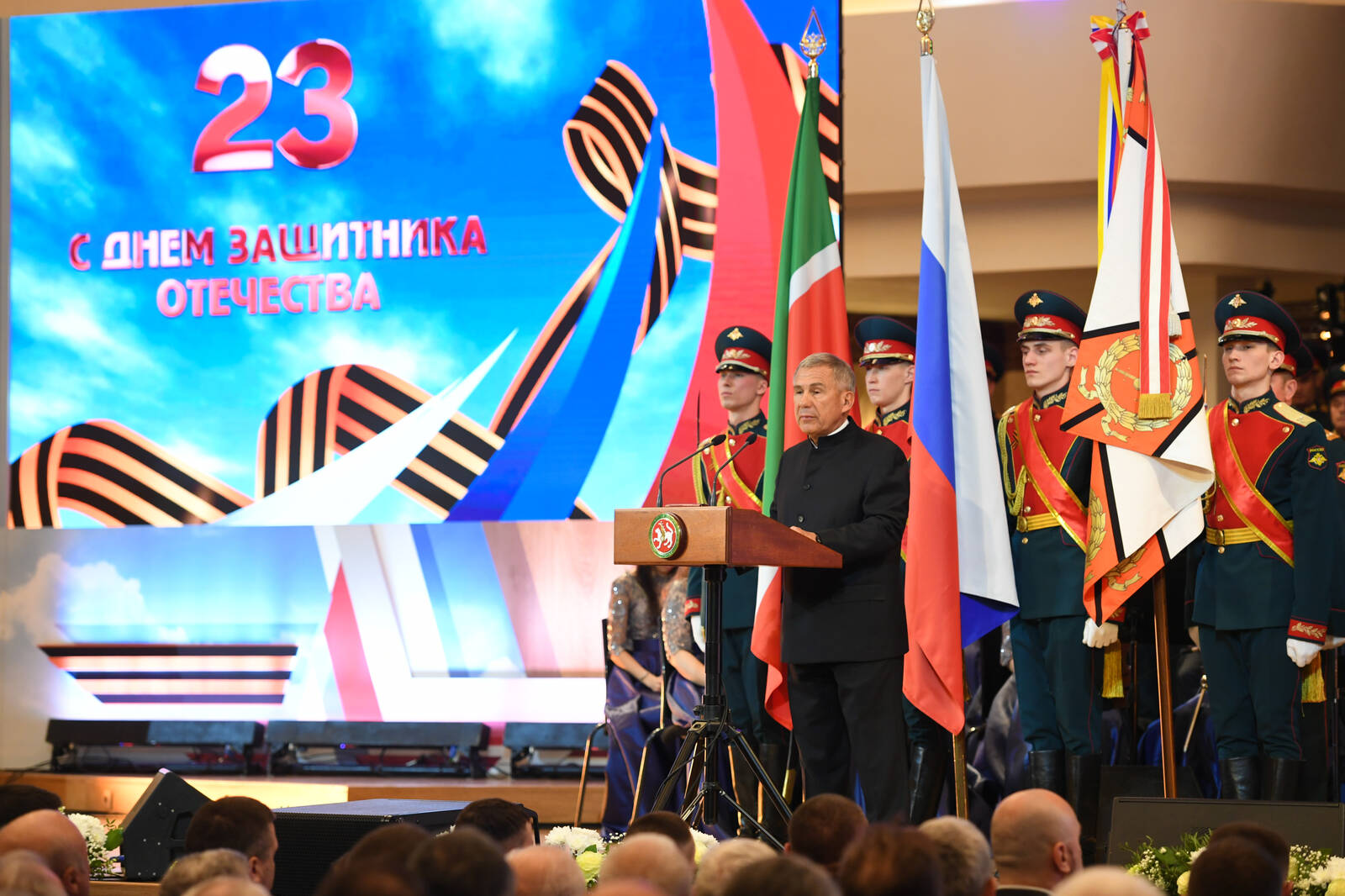 Торжественное мероприятие, посвящённое празднованию Дня защитника Отечества. Принимает участие Раис Республики Татарстан Р.Н. Минниханов.