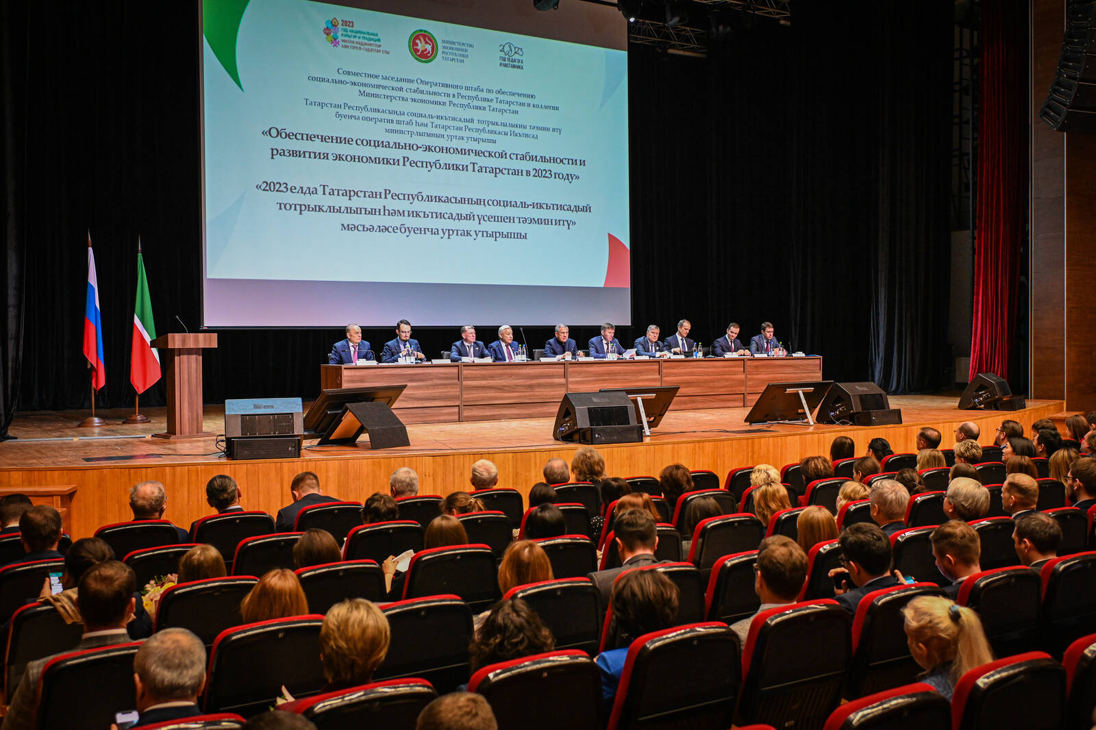Совместное заседание Оперативного штаба по обеспечению социально-экономической стабильности в Республике Татарстан и коллегии Министерства экономики Республики Татарстан по вопросу "Обеспечение социально-экономической стабильности и развития экономики Республики Татарстан в 2023 году". Принимает участие Раис Республики Татарстан Р.Н. Минниханов.
