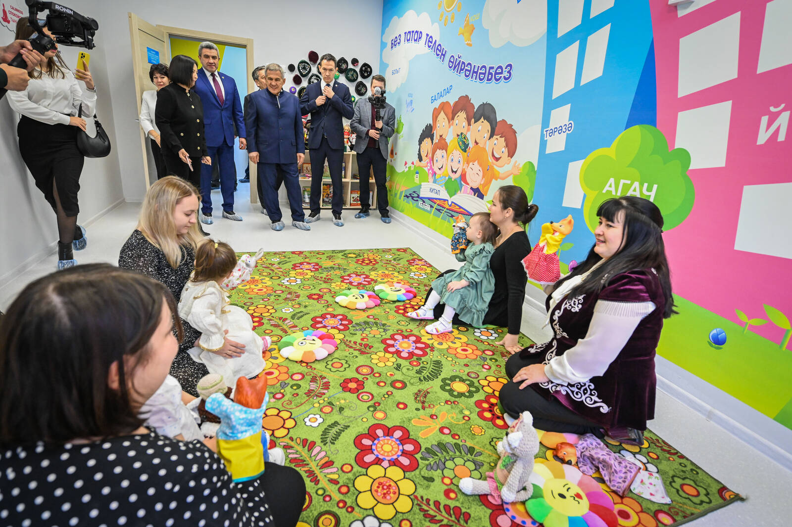 Посещение и открытие детского сада «Алсу» в Альметьевском муниципальном районе. Принимает участие Раис Республики Татарстан Р.Н. Минниханов.