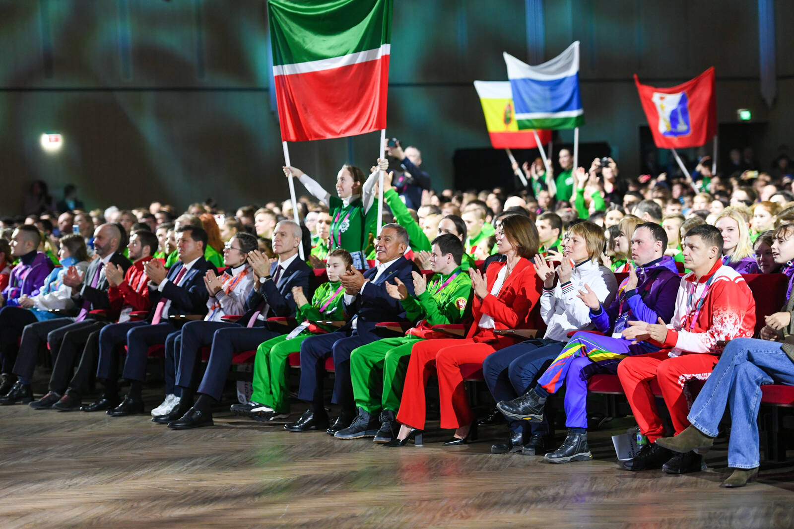 Торжественная церемония открытия Единых Игр Специальной Олимпиады. Принимают участие Президент Республики Татарстан Р.Н. Минниханов, Министр спорта Российской Федерации Олег Васильевич Матыцин, президент Специальной Олимпиады России Ольга Сергеевна Слуцкер.
