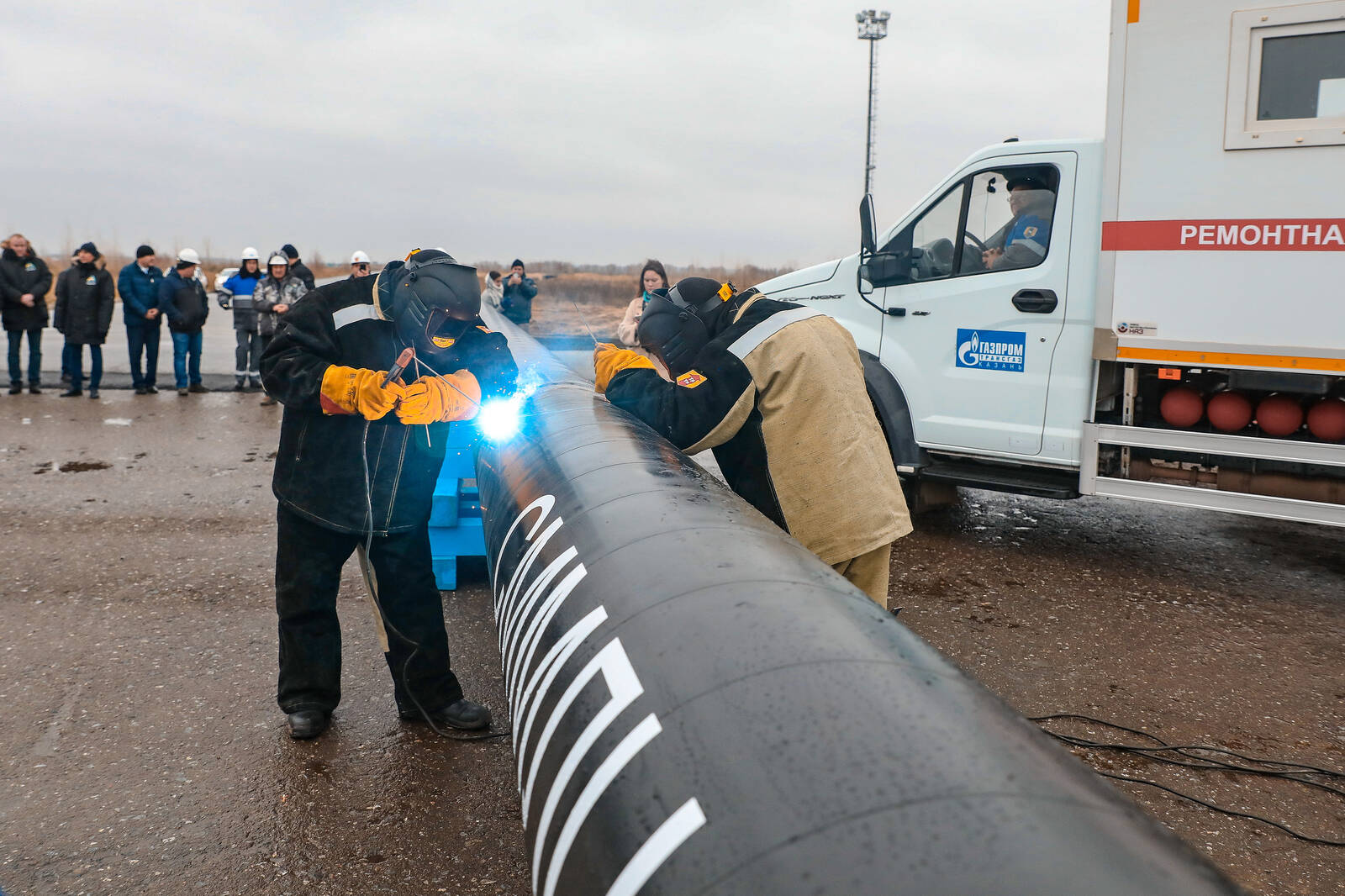Сварка первого стыка газопровода СММЛЦ. Принимают участие Президент Республики Татарстан Р.Н. Минниханов, Генеральный директор ООО "Газпром межрегионгаз" Сергей Вадимович Густов