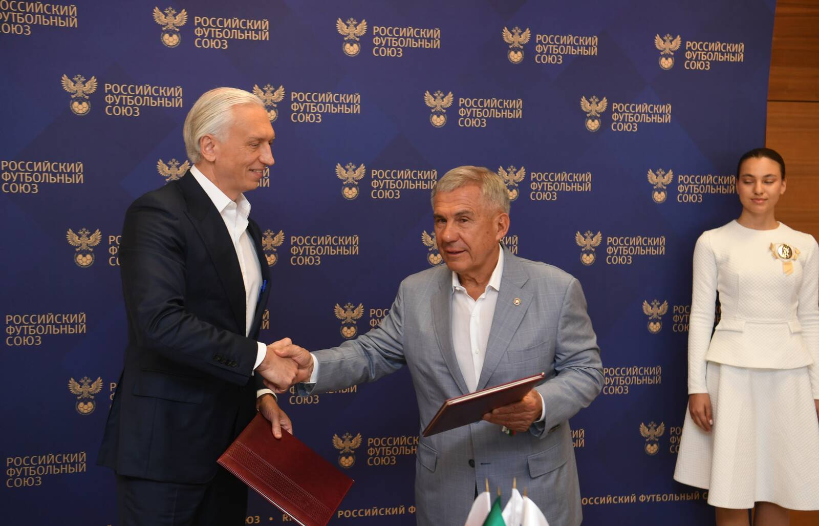 Церемония подписания Соглашения о сотрудничестве и взаимодействии в сфере развития вида спорта "футбол" между Министерством спорта Российской Федерации, Правительством Республики Татарстан, Общероссийской общественной организацией спортивной федерацией по футболу "Российский футбольный союз" и Региональной общественной организацией "Федерация футбола Республики Татарстан". Принимают участие Раис Республики Татарстан Р.Н.Минниханов, президент Российского футбольного союза А.В.Дюков.