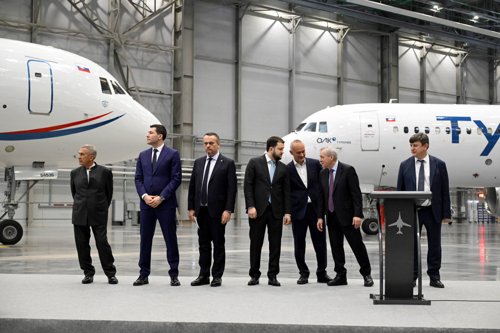 Церемония вручения свидетельства об Одобрении главного изменения типовой конструкции самолета Ту-214. Принимают участие Раис Татарстана Рустам Минниханов, министр промышленности и торговли России Антон Алиханов, министр транспорта России Андрей Никитин.